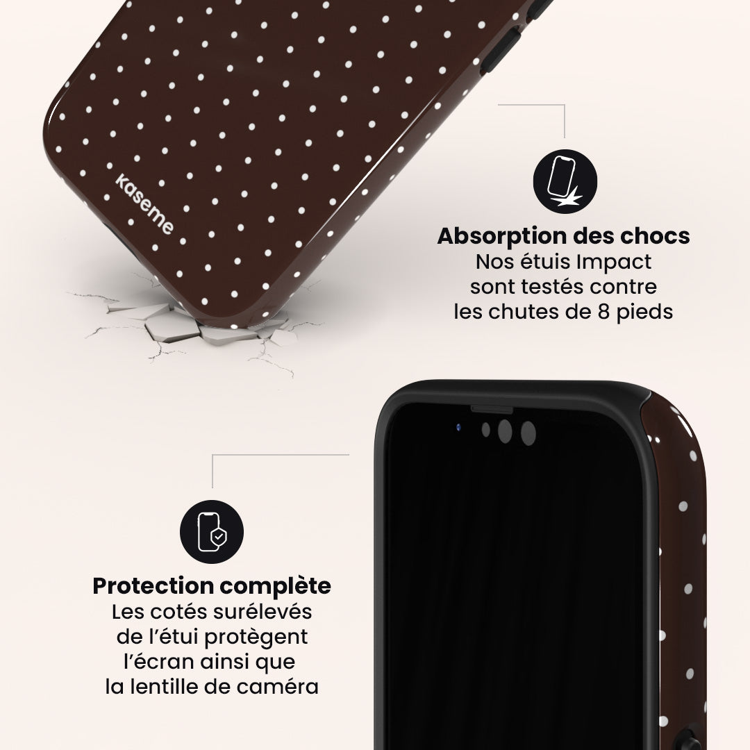 Nos étuis de téléphone impact sont très protecteurs. Ils sont constitués de 2 couches : une coque en PVC dur à l'extérieur et un TPU souple à l'intérieur. Ils sont testés contre les chutes jusqu'à 8 pieds !