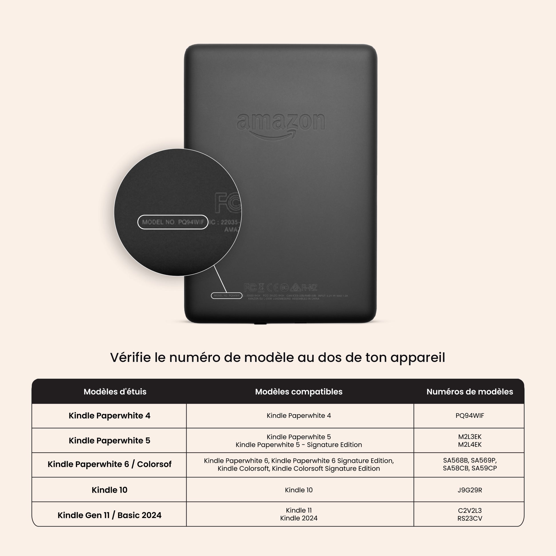 Pour trouver le modèle de Kindle, il suffit de regarder à l’arrière de l’appareil. Dans le bas, le numéro de modèle est inscrit. Une fois le numéro en main, assure-toi de le comparer avec le tableau de référence présent dans l’image #6 un peu plus haut afin de sélectionner le bon étui.