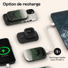 Le ChargePod s’adapte à ton quotidien en offrant trois options pratiques : la recharge par câble, la recharge sans fil Qi et la recharge magnétique MagSafe. À toi de choisir la solution la plus simple selon tes besoins.